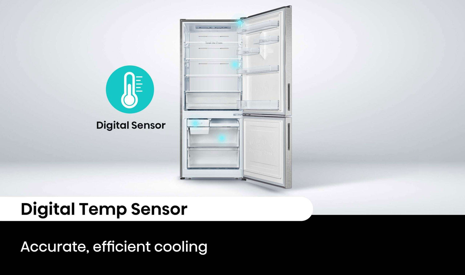 Accurate, efficient coolingDigital Temp SensorMultiple Digital Temperature Sensors are built into the refrigerator, which accurately and constantly inform our Durable Inverter to optimally adjust the cooling and freezing level of the refrigerator. |