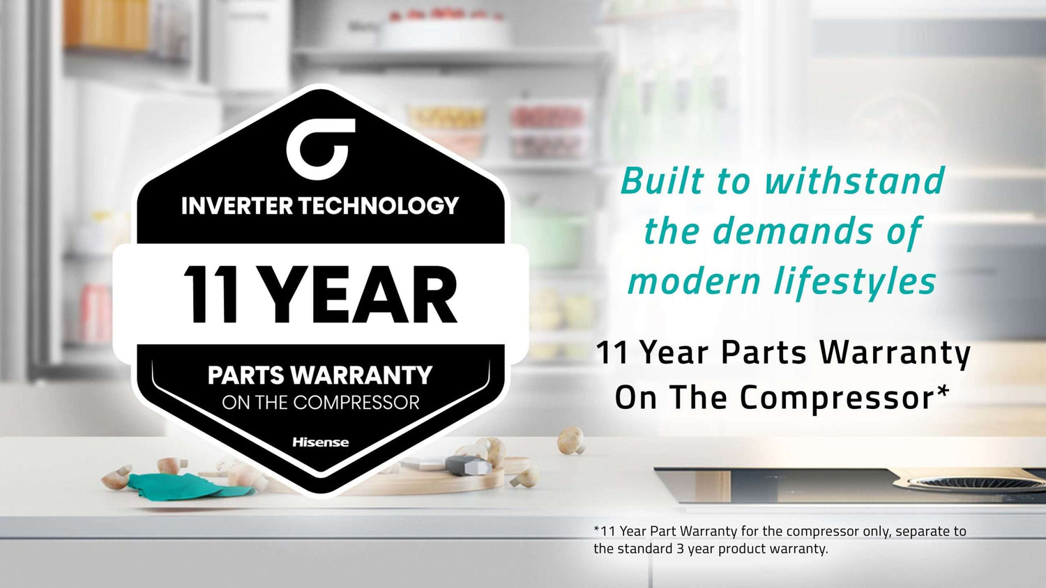 Built to withstand the demands of modern lifestylesHisense’s Inverter Technology always maintains an ideal temperature, resulting in everyday reliability for your family. That is why we offer a standard 3 Year Warranty with your fridge and also an 11 Year Parts Warranty on the Compressor. | ![]() |