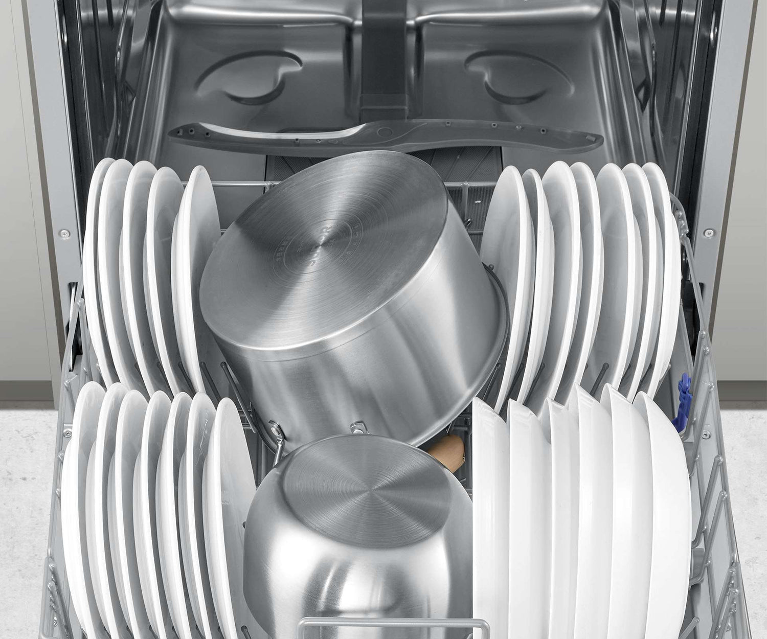 Flexible spots for your pans and potsFlexible Bottom BasketThis dishwasher is highly flexible with its fold-down tines in the lower basket. Since the cutlery rack is built into the top, no cutlery basket is necessary in the bottom basket, which frees up space to fit whatever you may need. |