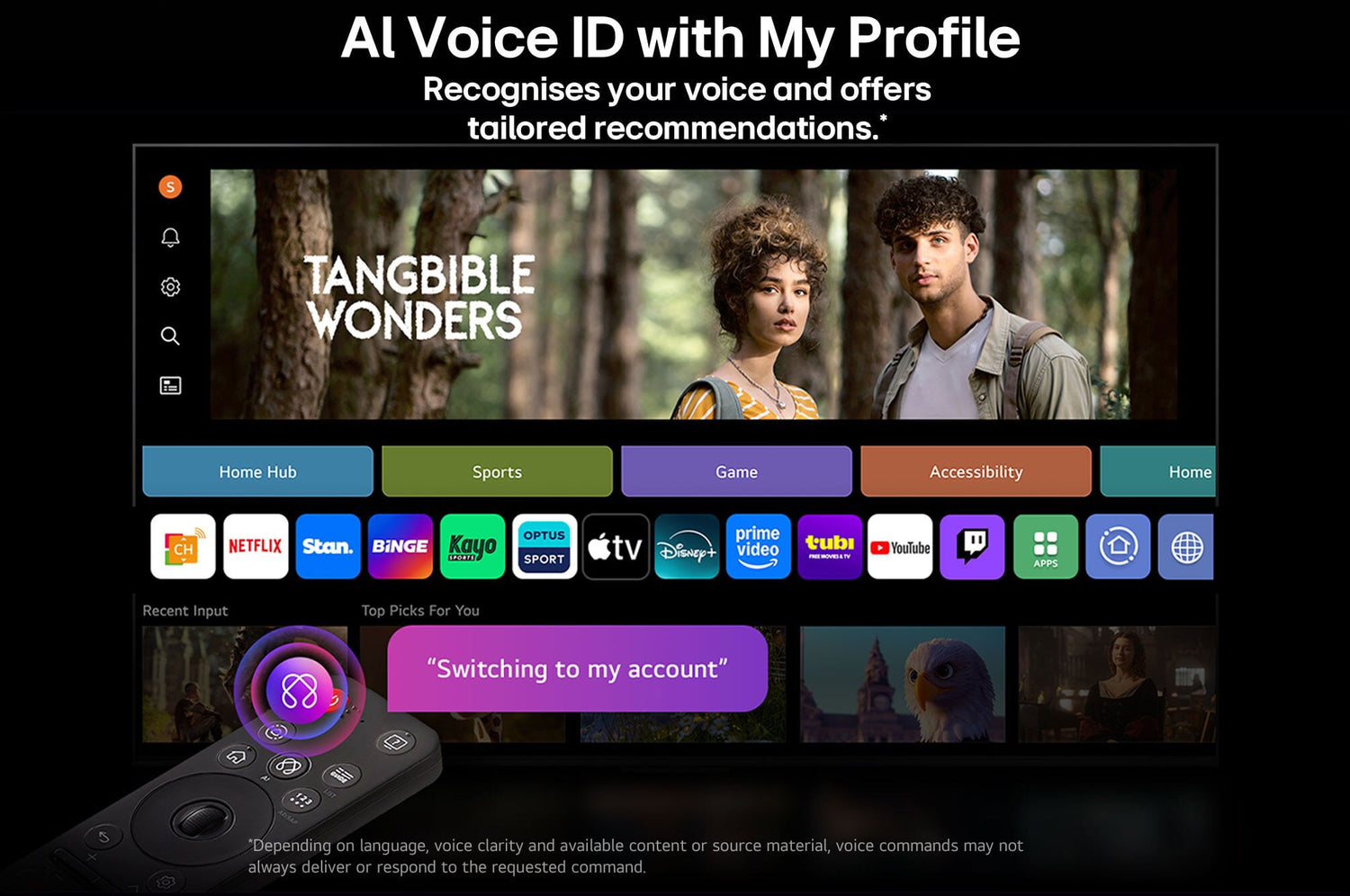 AI Voice ID with My ProfileSync your TV to your voiceGet personalised recommendations, just by asking. AI Voice ID recognises the unique signature of each voice to curate tailored viewing for everyone at home. Just press the remote's AI Button to get started.* |