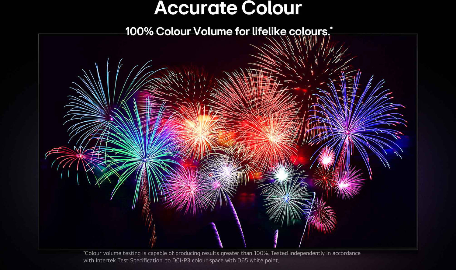 *Colour volume testing is capable of producing results greater than 100%. 100% Colour Volume independently tested in accordance with Intertek Test Specification to the DCI-P3 colour space with D65 white point.