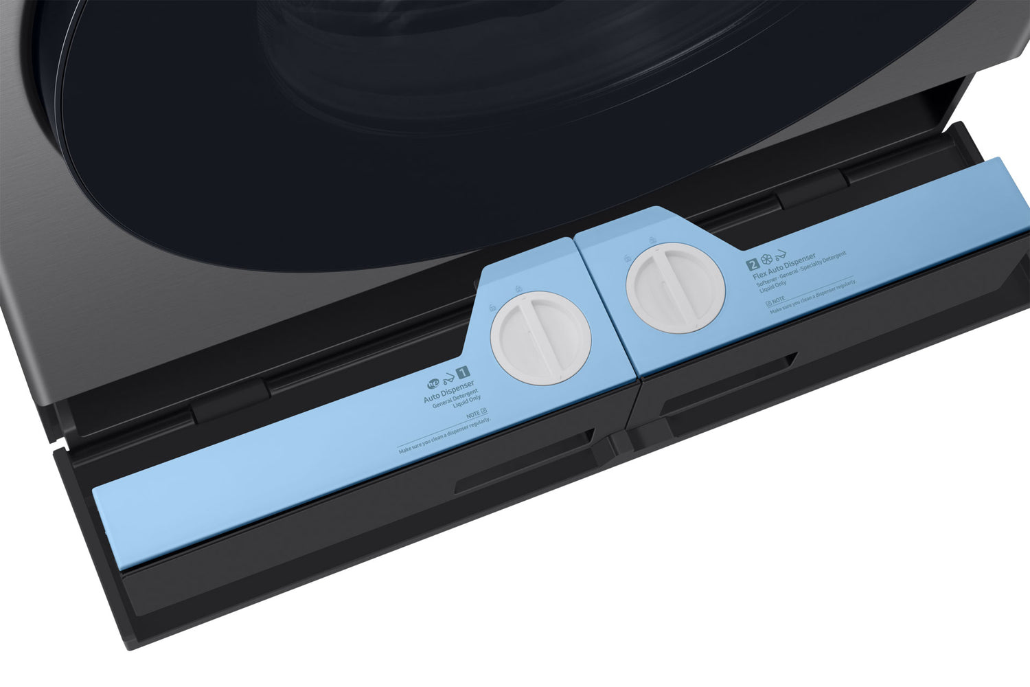 Automatic efficiencyFlex Auto DispenseYour washer will automatically dispense the appropriate amount of detergent and softener for each load, so you don’t need to worry about using too much or too little detergent. It also holds enough detergent & softener for up to 25 loads, or up to 47 loads if you only use detergent* in the flex dispenser. This way there is no need to fill up the detergent tank after every wash. * Expected number of loads: Detergent compartment can hold general detergent for up to 25 loads. Flex compartment can hold one of the following: softener for up to 34 loads, general detergent for up to 22 loads or specialty detergent for up to 29 loads. |